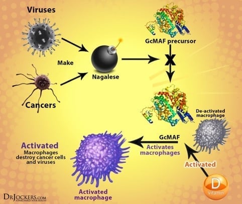 Gli agenti infettivi, per lo più, Herpes Virus come l’EBV, CMV, HHV6, HHV7 e altri virus sono fattori scatenanti la patologia, infatti, producono l’α-N-acetilgalattosaminidasi, detta Nagalase, che deglicosila la proteina DBP (proteina Gc), precursore del più importante fattore di attivazione macrofagica (MAF). La proteina Gc trasporta il trisaccaride Nagalase. Attraverso la deglicosilazione il trisaccaride viene rimosso dalla proteina Gc. La proteina Gc glicosilata non può più essere convertita in MAF, causando una riduzione del GcMAF. Con la riduzione del GcMAF si ha una ridotta attivazione dei macrofagi, i quali non riconoscono e uccidono le cellule tumorali e infette da virus. Si allega schema riassuntivo del meccanismo della Nagalase e del GcMaf.