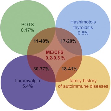 La ME/CFS presenta nella maggior parte dei casi, comorbilità con la Fibromialgia, altre patologie autoimmuni, la tiroidite di Hashimoto e sindrome da tachicardia posturale ortostatica.