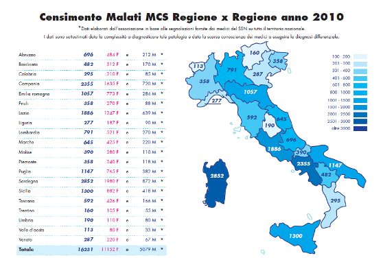 Con una forbice di prevalenza che va da 0,5% al 3%, l’Italia che ha una popolazione di circa 60 milioni di abitanti, potrebbe avere dai 300 mila ai 1,8 milioni di abitanti con diagnosi di MCS. Ma quali sono i dati reali? In Italia non è stato condotto al momento nessuno studio epidemiologico. Secondo un censimento effettuato da alcune associazioni MCS ma mai registrato, sul territorio nazionale potrebbero esserci circa 16 mila pazienti, ma tale numero non è in linea con gli studi sopra citati. Nel Centro di Riferimento per la Prevenzione, Diagnosi e Terapia della MCS presente al Policlinico Umberto I della Regione Lazio, nel maggio 2014, erano stati registrati sulla piattaforma regionale 416 pazienti così suddivisi: