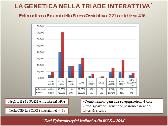 In diapositiva (sopra) è evidente che pazienti con la Sensibilità Chimica Multipla, rispetto a un gruppo di controllo, presentano polimorfismi degli enzimi dello stress ossidativo che determinano un alterato funzionamento dell’enzima stesso. Questi dati sono in linea con i numerosi studi fin ora pubblicati soprattutto da ricercatori italiani. La presenza di un polimorfismo della GSTM1 e GSTT1 nullo determina quindi un deficit di attività della glutatione trasferasi, la quale oltre a inattivare gli agenti cancerogeni, coniuga con il glutatione tutta una serie di sostanze xenobiotiche per renderle meno reattive e quindi più facilmente eliminabili dall’organismo. Un deficit di attività di tale enzima riduce la capacità di coniugazione delle sostanze xenobiotiche ed espone organismo a bio-accumuli in caso anche di piccole esposizioni (continue nel tempo). Anche la presenza di un polimorfismo GSTP1 eterozigote o omozigote mutato determina un deficit di attività della glutatione trasferasi. Mentre però nella forma eterozigote vi è un allele normale, nell’omozigote mutato entrambe le forme alleliche sono alterate per cui aumenta il deficit dell’attività enzimatica. La presenza di un polimorfismo SOD eterozigote o omozigote mutato determina un deficit di attività della Super Ossido Dismutasi 2. La SOD 2 si trova nel mitocondrio e dismuta il super ossido trasformandolo in acqua ossigenata e O2 e viceversa. Un deficit della SOD2 mitocondriale espone quindi il mitocondrio di una cellula a maggiori danni ossidativi con possibile alterazione della fosforilazione ossidativa e alterata produzione anche di ATP (carburante della cellula). Abbiamo constatato che nei pazienti con diagnosi di sindrome da affaticamento cronico, la SOD risulta mutata con una percentuale statisticamente maggiore rispetto alla popolazione normale. Questo potrebbe spiegare il perché pazienti con tale patologia lamentano spesso sintomi di astenia, affaticamento, rapido esaurimento delle energie, deficit di forma.