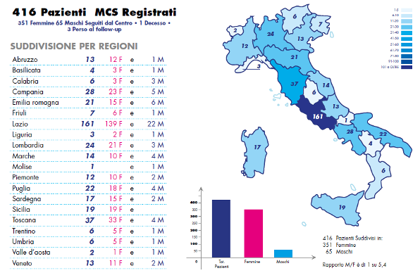 Secondo l’ultimo rapporto del 2015 emanato dalla Regione Lazio e pubblicato a Dicembre 2016 vi erano registrati in piattaforma regionale 512 pazienti MCS, pari all’1,88% di tutte le patologie rare, con una crescita esponenziale in 4 anni da circa 20 a 512. Ricordo che per i pazienti con MCS il centro era aperto 1-2 giorni a settimana e si effettuavano circa 100 nuove diagnosi all’anno.