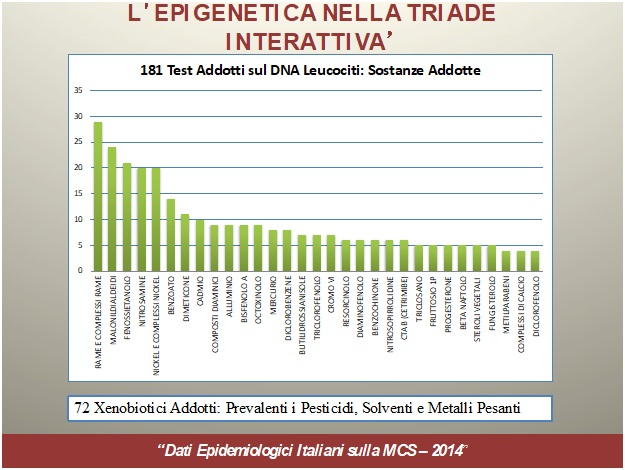 Queste indagini di laboratorio hanno permesso di identificare le sostanze a cui i pazienti MCS sono stati esposti, hanno inalato o ingerito. Su 181 test sono state ritrovate 72 differenti tipi di sostanze addotte, prevalentemente pesticidi, erbicidi e insetticidi, solventi e metalli pesanti. L’analisi di tali risultati ci permette di fare un’altra osservazione scientifica molto importante. Abbiamo detto che uno dei meccanismi eziopatogenetici della MCS, secondoMartin Pall, è l’iperattivazione dei recettori NMDA e il circolo vizioso NO/ONOO che si determinano in seguito all’esposizione a specifiche sostanze xenobiotiche come pesticidi, erbicidi, insetticidi e solventi. La presenza di tali sostanze sugli addotti sul DNA dei leucociti è una possibile riprova scientifica che tale meccanismo eziopatologico, citato da Pall, potrebbe essere la vera causa di sensibilizzazione e che il quadro clinico e sintomatologico descritto da pazienti con MCS che si manifesta in seguito a esposizione a determinati VOC e sostanze xenobiotiche, sono effetti fisici e biochimici e non disturbi psicosomatici.