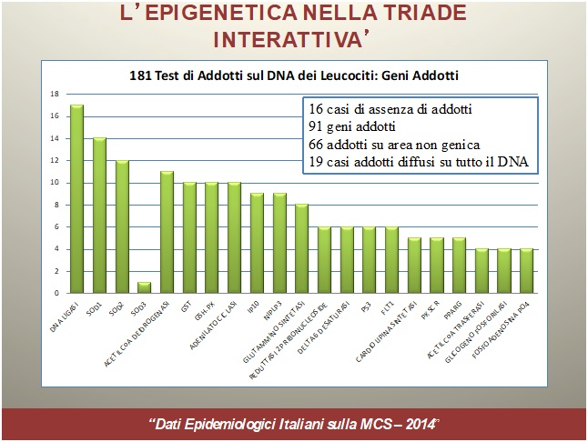 Dai risultati dei test condotti su pazienti con MCS si è evidenziato che i geni prevalentemente addotti sono quelli che svolgono un ruolo importante per la trascrizione di enzimi dello stress ossidativo. La presenza di un addotto su tale gene ne impedisce, di conseguenza, la corretta e completa trascrizione, per cui vi è una ridotta espressione della proteina e un deficit ulteriore nelle fasi di detossificazione cellulare. In alcuni casi, sono stati addotti anche geni importanti come la proteina P53 che svolge un ruolo importante nella cancerogenesi. In totale su 181 test sono stati identificati 91 geni addotti, ma contemporaneamente in 19 casi si è evidenziata anche la presenza di addotti diffusi su tutta la sequenza del DNA.