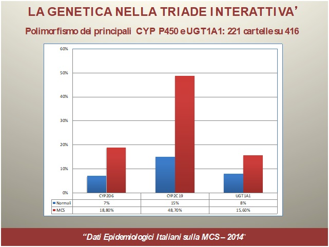 Si è constato che nei pazienti con MCS, seguiti sempre nel centro di Riferimento regionale del Policlinico Umberto I, vi è un aumento statisticamente significativo dei polimorfismi eterozigoti e omozigoti mutati PON1 A585G e C108T rispetto alla popolazione normale. La paraoxonasi, oltre a prevenire la perossidazione delle LDL e contrastare quindi il processo aterosclerotico, svolge un ruolo importante proprio nella detossificazione degli insetticidi organi fosfati (24,25). Un deficit di attività di tale enzima potrebbe essere anche la causa del bio-accumulo di insetticidi, erbicidi e pesticidi nei pazienti con MCS, come evidenziato dagli esami sugli addotti del DNA e dagli esami della sensibilità linfocitaria a tali composti. Ritornerò su questo argomento successivamente. Anche le frequenze dei polimorfismi dei geni codificanti i citocromi P450, le principali proteine coinvolte nel metabolismo dei farmaci e sostanze xenobiotiche, evidenziano alterazioni statisticamente significative rispetto alla popolazione normale soprattutto per i polimorfismi dei CYP2D6 e 2C19.