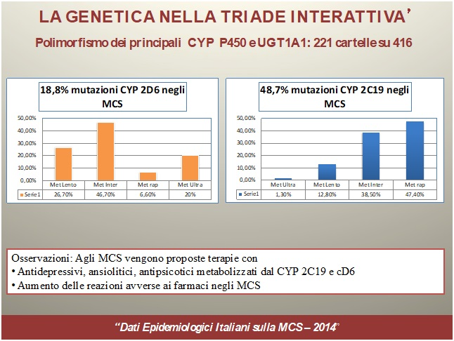 I CYP2D6 e 2C19 sono i principali citocromi che metabolizzano i farmaci antidepressivi, ansiolitici, antipsicotici. Una presenza di un polimorfismo metabolizzatore rapido o lento o intermedio nei pazienti con MCS oltre a causare una alterata metabolizzazione delle sostanze xenobiotiche, determina nei pazienti con MCS un aumento delle reazioni avverse e inefficacia farmacologica in caso di utilizzato di farmaci sopra citati. Ai pazienti con MCS, in molti casi, vengono prescritti farmaci ansiolitici e antidepressivi come trattamento della patologia, spesso con conseguente possibile aggravamento del quadro clinico e sintomatologico se tali farmaci non vengono dosati in base alle caratteristiche individuali del paziente. È un approccio del tutto sbagliato: spesso i pazienti descrivono al proprio medico un aggravamento del quadro clinico e sintomatologico e non vengono compresi, ma questa è una delle possibili spiegazioni.